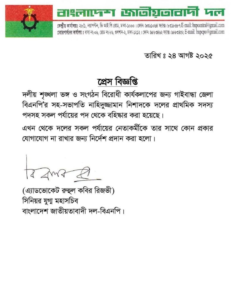 দলীয় শৃঙ্খলা ভঙ্গ ও সংগঠন বিরোধী কার্যকলাপের জন্য গাইবান্ধা জেলা বিএনপি’র সহ-সভাপতি নাহিদুজ্জামান নিশাদকে দলীয় পদ থেকে বহিস্কার করা হয়েছে।