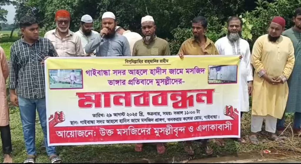 গাইবান্ধার যুবলীগ নেতা কর্তৃক মসজিদ ভাঙার অভিযোগে মুসুল্লী ও এলাকাবাসীর আয়োজনে মানববন্ধন অনুষ্ঠিত হয়েছে।